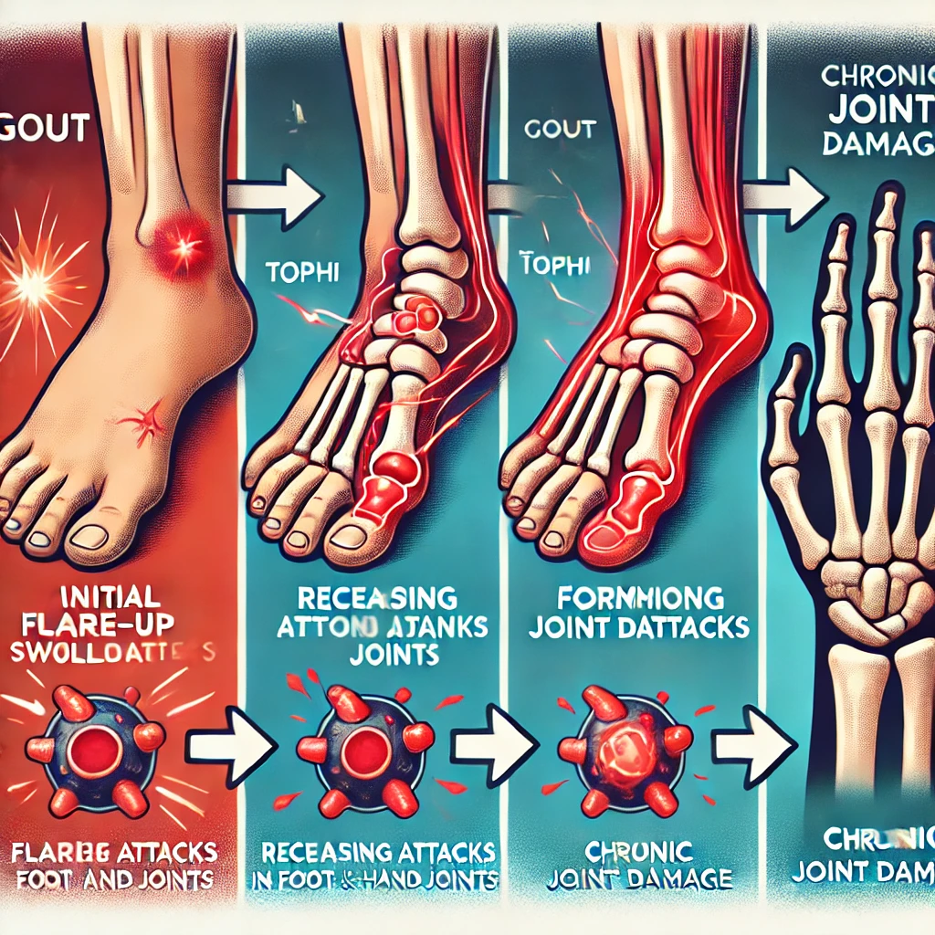 통풍은 단순히 ‘한 번의 극심한 통증’으로 끝나는 질환이 아닙니다. 제대로 관리하지 않으면 시간이 지날수록 발작 주기는 짧아지고, 통증은 더 심해지며, 관절 손상과 신장 질환 등 다양한 합병증으로 이어질 수 있습니다. 이번 장에서는 통풍이 어떻게 시작되어 어떤 식으로 악화되는지 단계별로 정리하고, 각 단계에서 나타나는 특징적인 증상과 예방법을 함께 살펴보겠습니다.